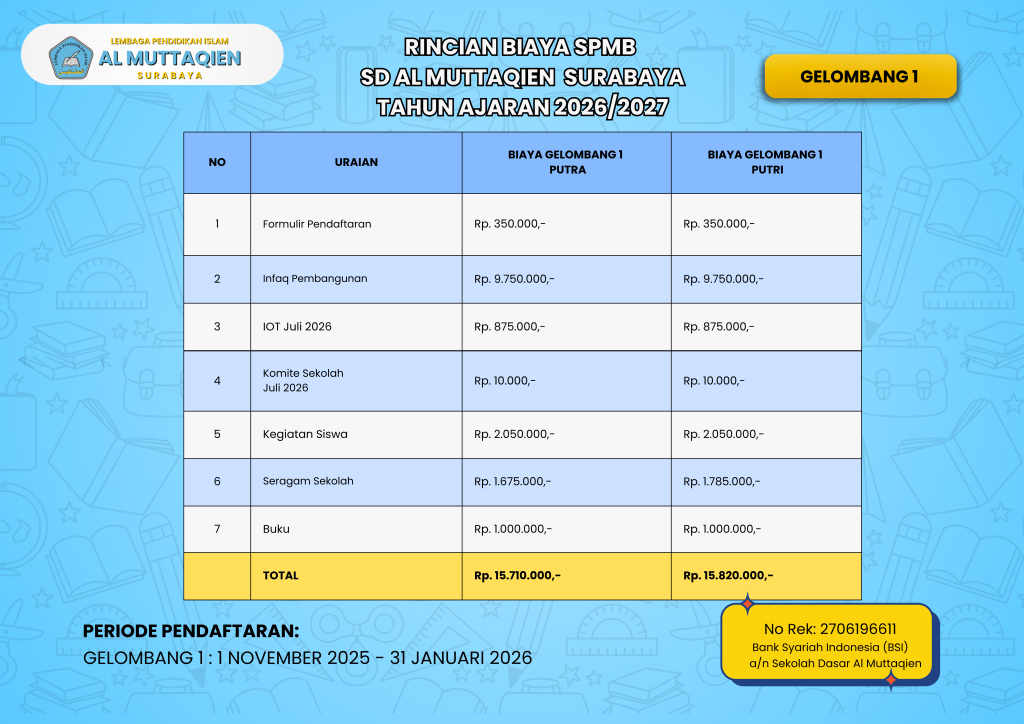 DAFTAR SEKARANG SPMB 2026-2027 Gelombang 1 Syarat Pendaftaran Usia calon siswa 6 tahun – 7 tahun, lulusan TKMengisi formulir pendaftaran secara online Mengirim KK, Akte kelahiran secara online Menyerahkan fotocopy ijazah/SKTB TK sebanyak 1 (satu) lembar menyusulPas foto ukran 3×4 secara online RINCIAN PEMBIAYAAN SPMB SD AL-MUTTAQIEN GELOMBANG 1 ALUR PENDAFTARAN Pendaftaran Online Mari Bergabung Bersama Kami SD AL-MUTTAQIEN Sekolah Iman Akhlak & Prestasi CP 1 Ustadzah Nia CP 2 Ustadzah Tina Profil SD